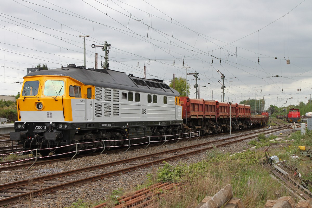 SGL V300.18 stand am 15.4.14 mit einem Schotterzug in Düsseldorf-Rath.