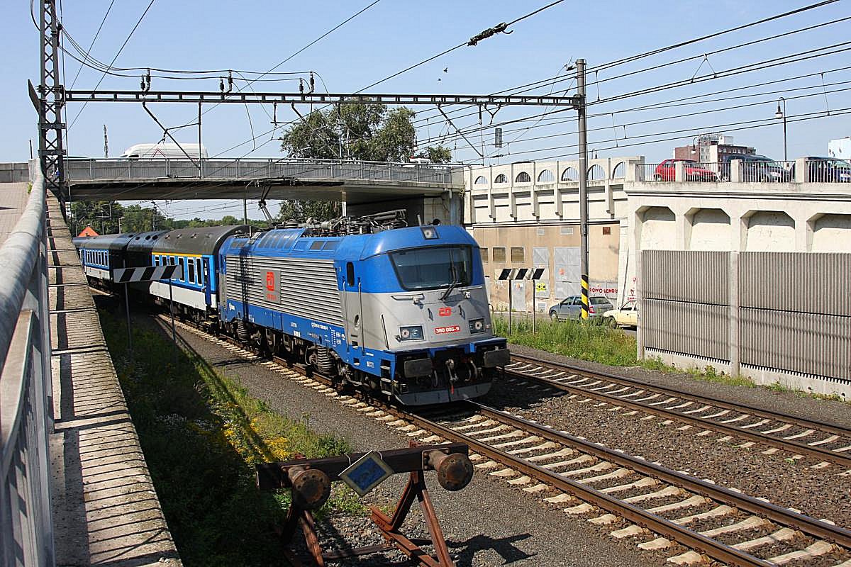 Skoda Neubau Lok 380005 fährt am 22.8.2011 mit einem Intercity aus Prag kommend in Kolin ein.