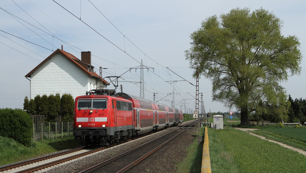 111 017 mit einem RE nach Passau am 24.04.2014 bei Langenisarhofen.