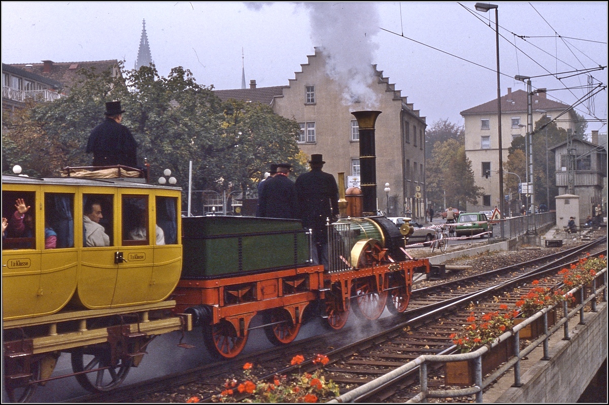 120 Jahre Bahnhof Konstanz. Anlass für einen Besuch des Adlers. Rechts steht noch das Stellwerk gegenüber dem Konzil. Konstanz, Mai 1983.