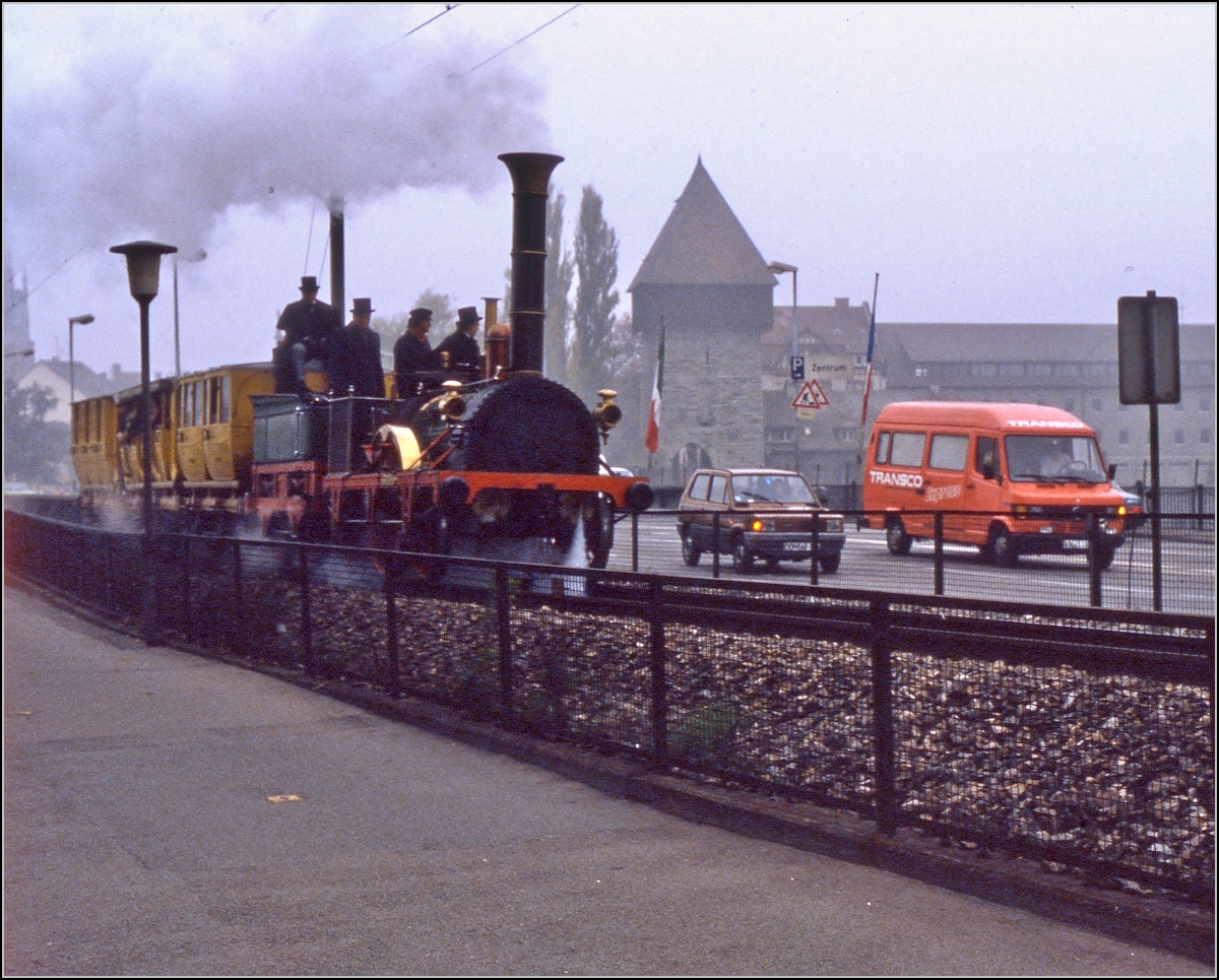 120 Jahre Bahnhof Konstanz. Anlass für einen Besuch des Adlers, hier an der Rheinbrücke. Auch wenn die Strecke heute betrieblich zur Schwarzwaldbahn gehört, so ist sie doch das Ende der badischen Hauptbahn, daher von mir zur Hochrheinbahn zugeordnet. Konstanz, Mai 1983.