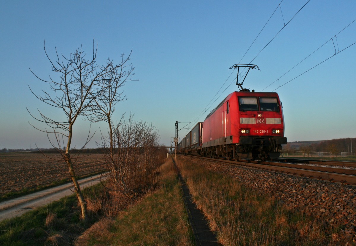 145 030-3 mit einem KLV-Zug gen Weil am Rhein/Basel Rbf am Abend des 08.03.14 südlich von Hügelheim.