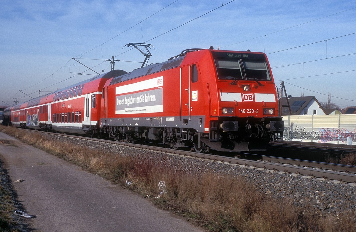 146 231-6 mit einem frühabendlichen RE von Offenburg nach Basel Bad. Bf am 08.03.14 bei Hügelheim.
