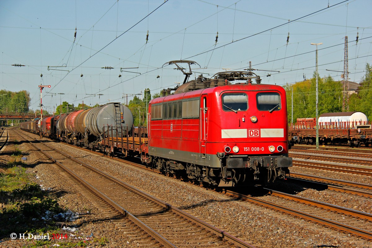 151 008-0 mit einem gemischten Güterzug am 16.04.2014 in Düsseldorf Rath.