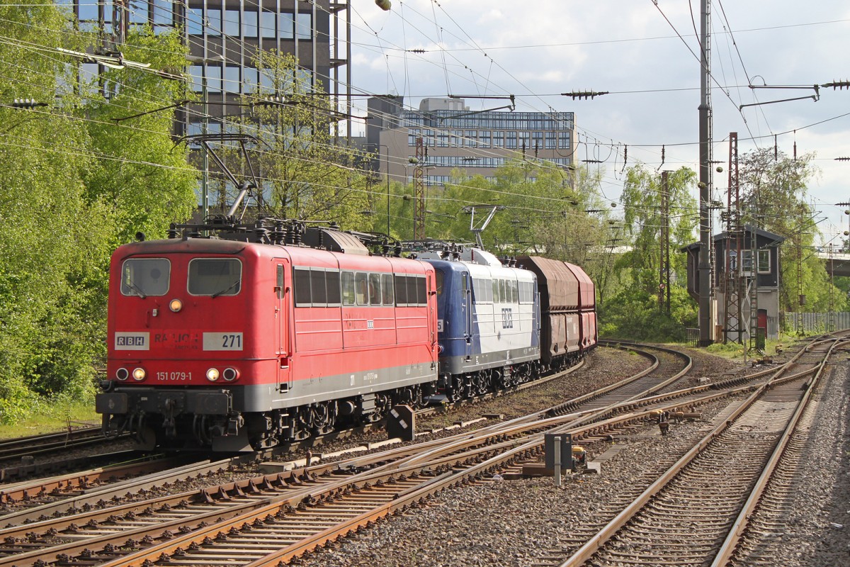 151 079 (RBH 271) und 151 021 (RBH 265) fuhren am 15.4.14 mit einem Kohlezug durch Düsseldorf-Rath.