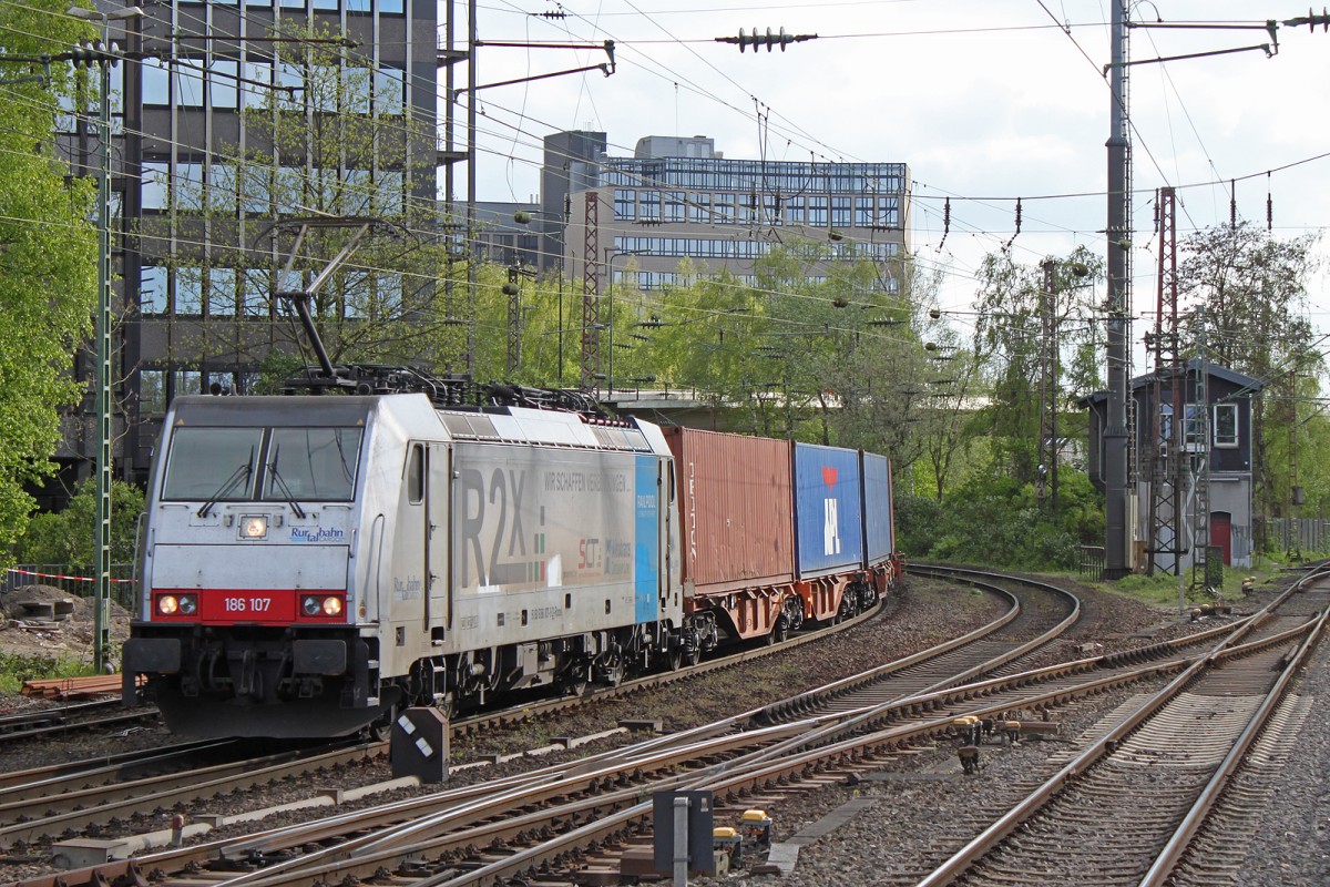 186 107 fuhr am 15.4.14 mit einem Containerzug durch Düsseldorf-Rath.