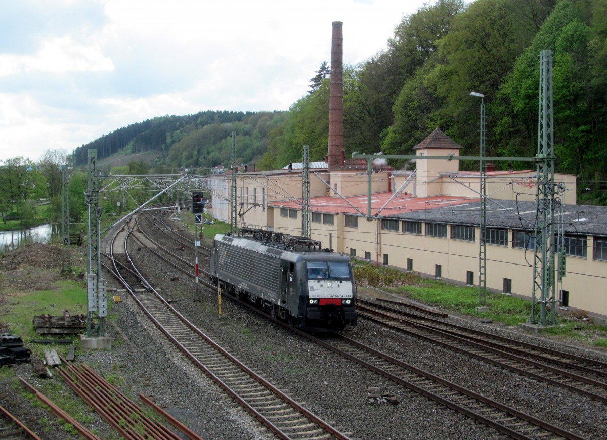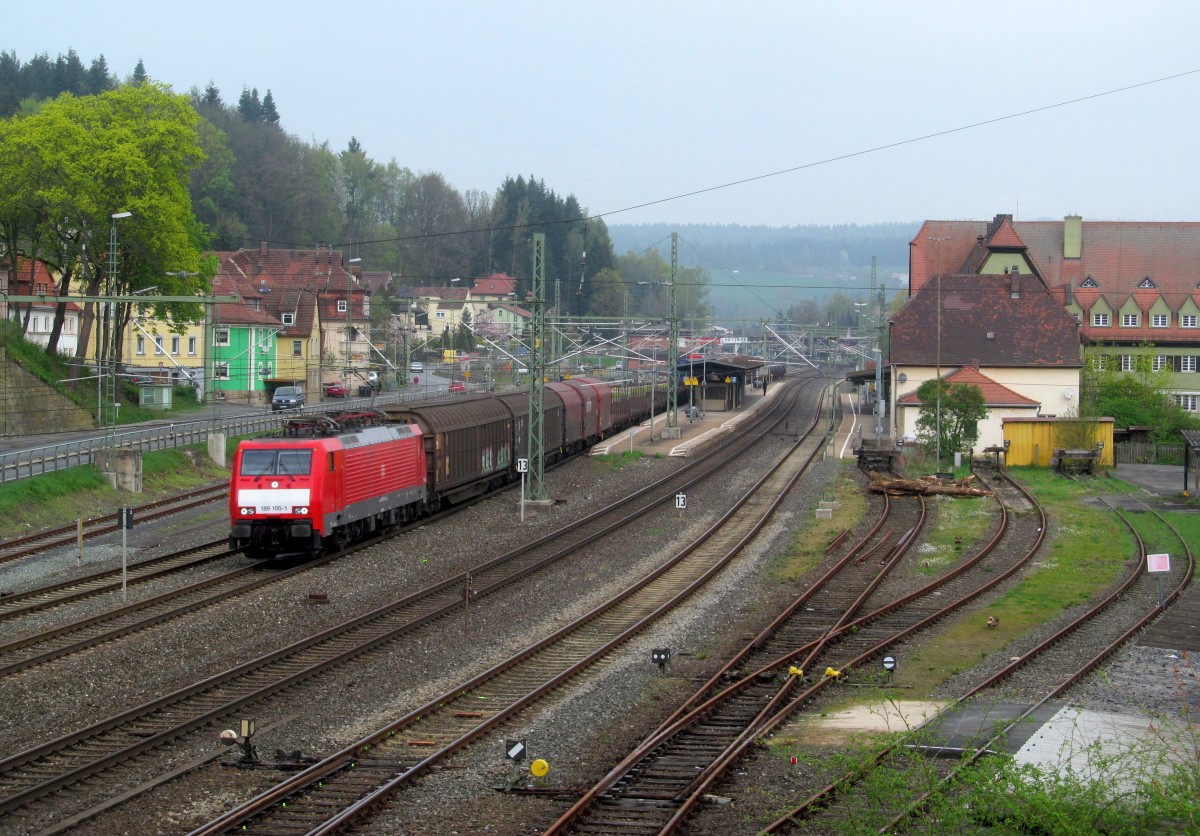189 100-1 zieht am 12. April 2014 einen gemischten Güterzug durch Kronach in Richtung Lichtenfels.