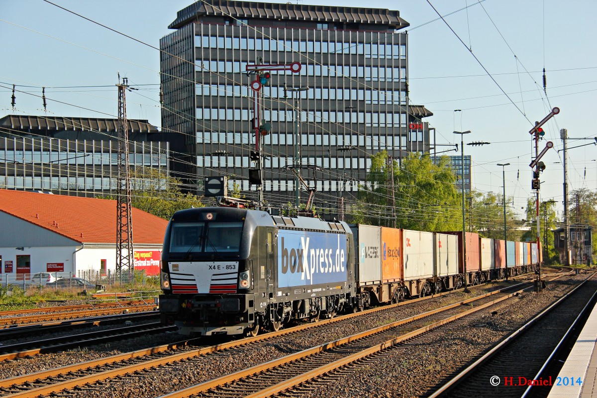 193 853/X4 E-853 BoxXpress mit einem Containerzug am 16.04.2014 in Düsseldorf Rath.