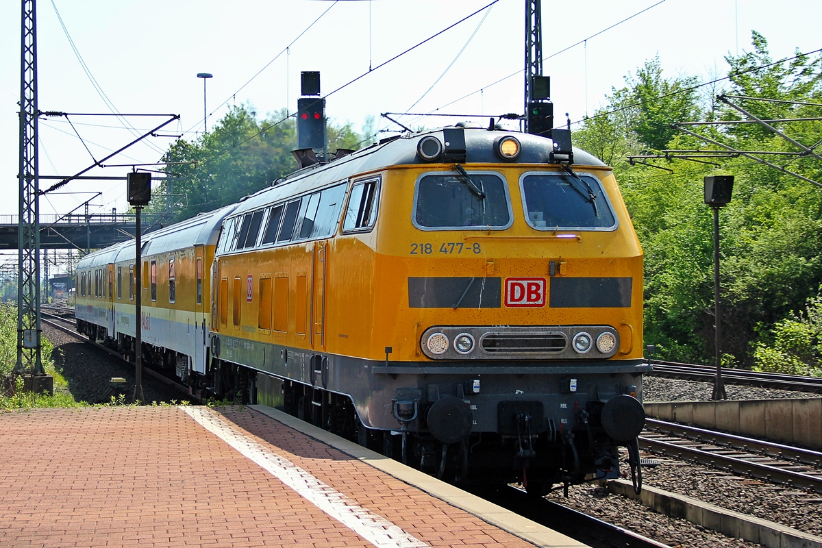 218 477-8 als Schienenmesszug unterwegs aus südlicher Richtung bei der Einfahrt in Kassel Wilhelmshöhe. 25.04.2014