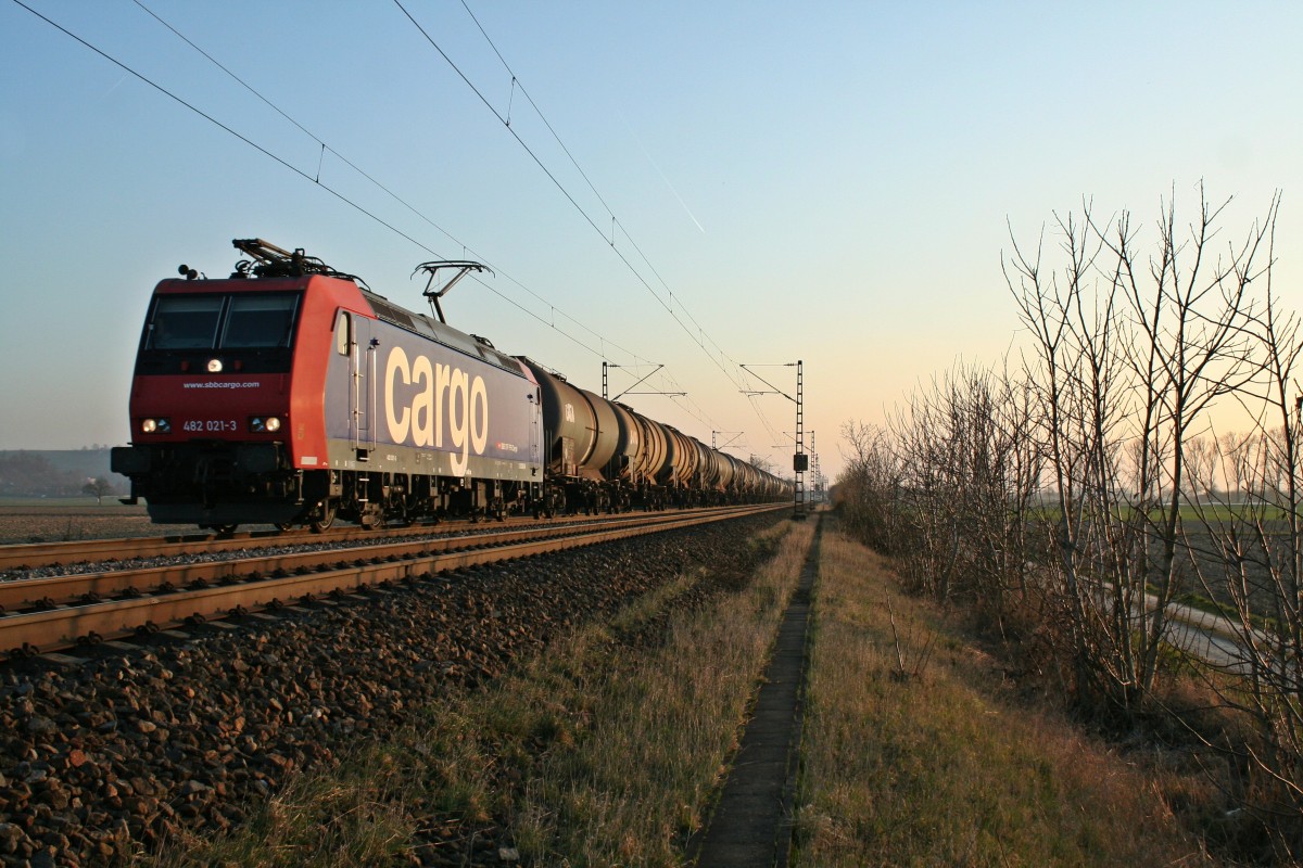 482 021-3 mit einem Kesselzug gen Norden im Abendlicht des 06.03.14 südlich von Hügelheim.