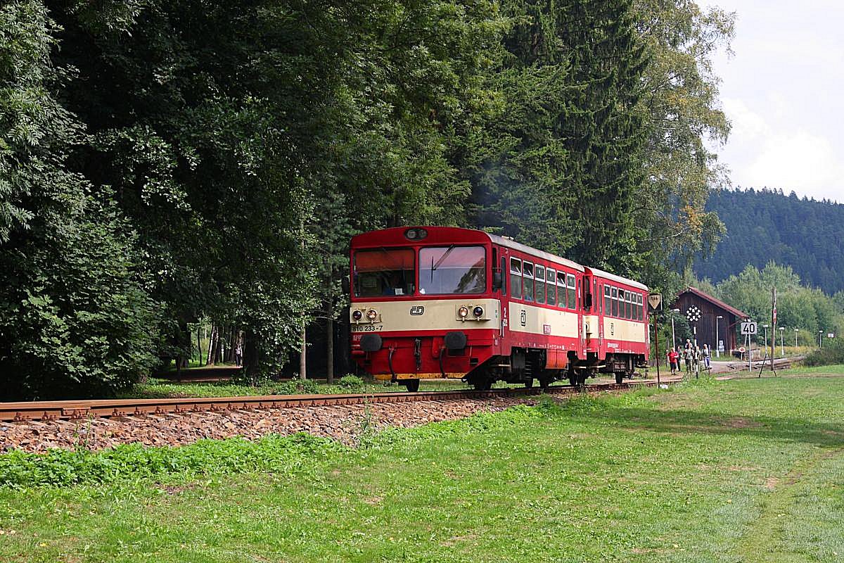 Der in Tschechien bekannte Ausflugsort Adspach mit seinem sehenswerten Felsenmeer hat auch einen Bahnanschluss. Viele Ausflügler nutzen die Bahn, so dass die Triebwagen in der Sommersaison immer gut besetzt sind. Am 21.8.2013 fotografierte ich in dem Waldbahnhof Adrspach den 810233, der gerade aus Teplice nad Martuji angekommen war.