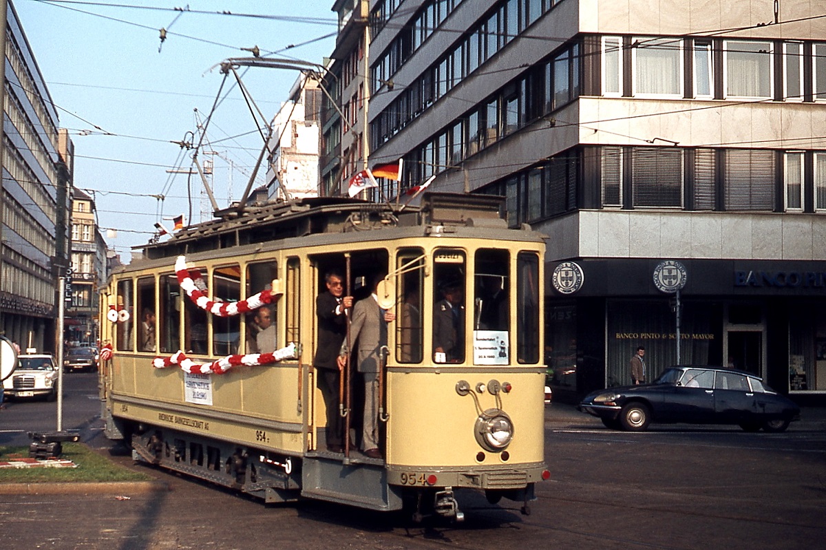 Am 20.09.1980 biegt der Rheinbahn-Museums-Tw 954 von der Bismarckstraße auf den Bahnhofsvorplatz ein. Das Fahrzeug gehört zu einer zwischen 1927 und 1929 von Schöndorff/SSW gelieferten Serie und verkehrte an diesem Tag aus Anlass des 1. Spatenstichs zum Umbau des Düsseldorfer Hauptbahnhofes.