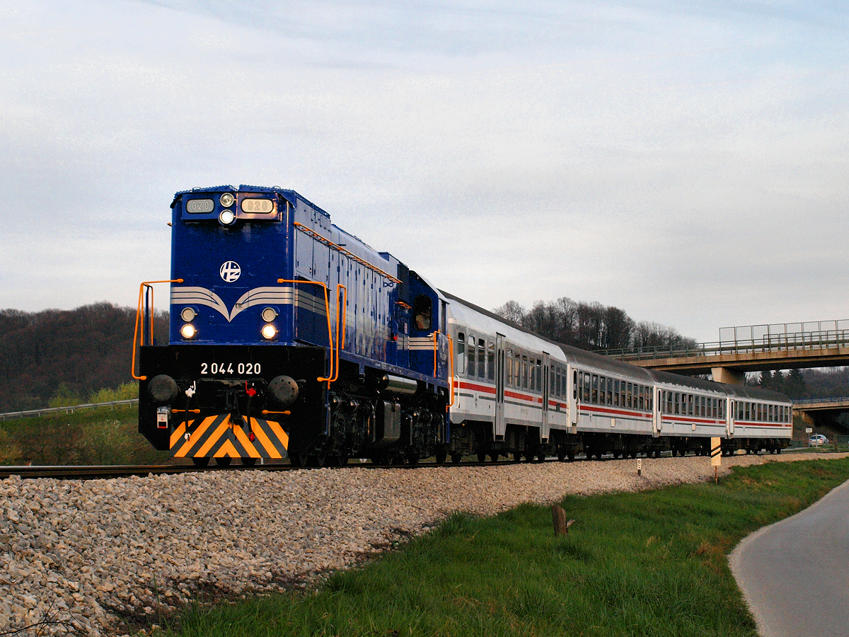 Die frisch hauptuntersuchte 2044 020, einen Tag nach ihrer Wiederinbetriebnahme, passiert mit dem Personenzug Pu 3017 die letzte Kurve vor der Einfahrt in Zabok / 21.03.2014.