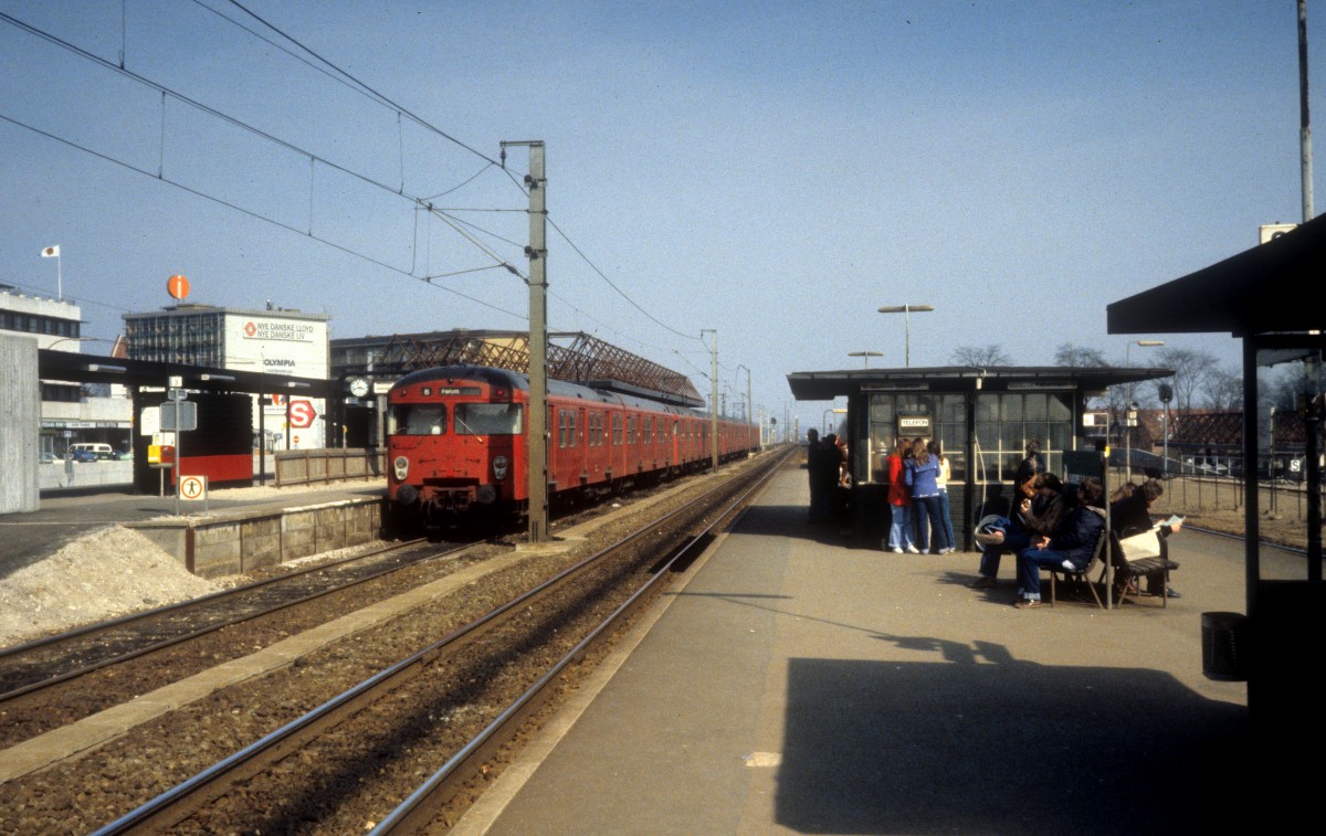 DSB S-Bahn Kopenhagen: Linie B am Endbahnhof Tåstrup am 13. April 1980. - Auf dem Bild ist es deutlich zu sehen, dass die Hauptbahnstrecke Kopenhagen - Roskilde noch nicht elektrifiziert worden ist.
