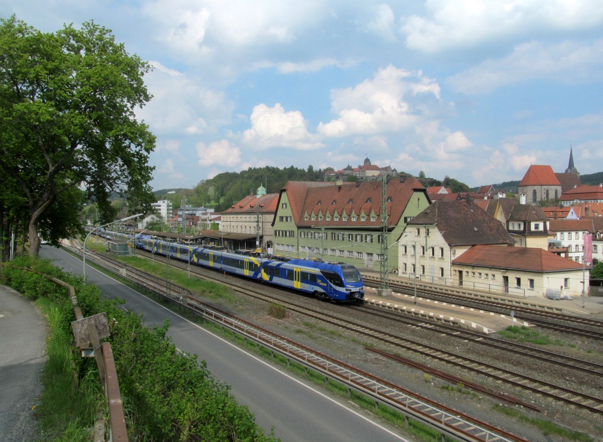 ET 328, ET 317 und ET 302 der BOB stehen am 24. April 2014 im Bahnhof Kronach.