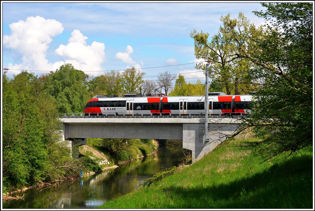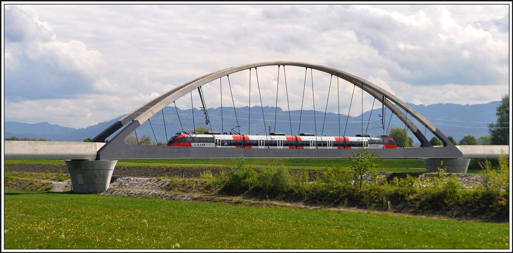 Im Sommer 2013 wurden zwischen St.Margrethen und Lustenau drei neue Brücken in Betrieb genommen. 1. die Bogenbrücke über die Autobahn N13 2. die Brücke über den Binnenkanal 3. die grosse Bogenbrücke mit den beiden Vorlandbrücken über den Rhein. Der Streckenverlauf ist einspurig. RE5755 mit einem Triebzug der BR 4024 aus Bregenz überquerte soeben die N13. (22.04.2014)
