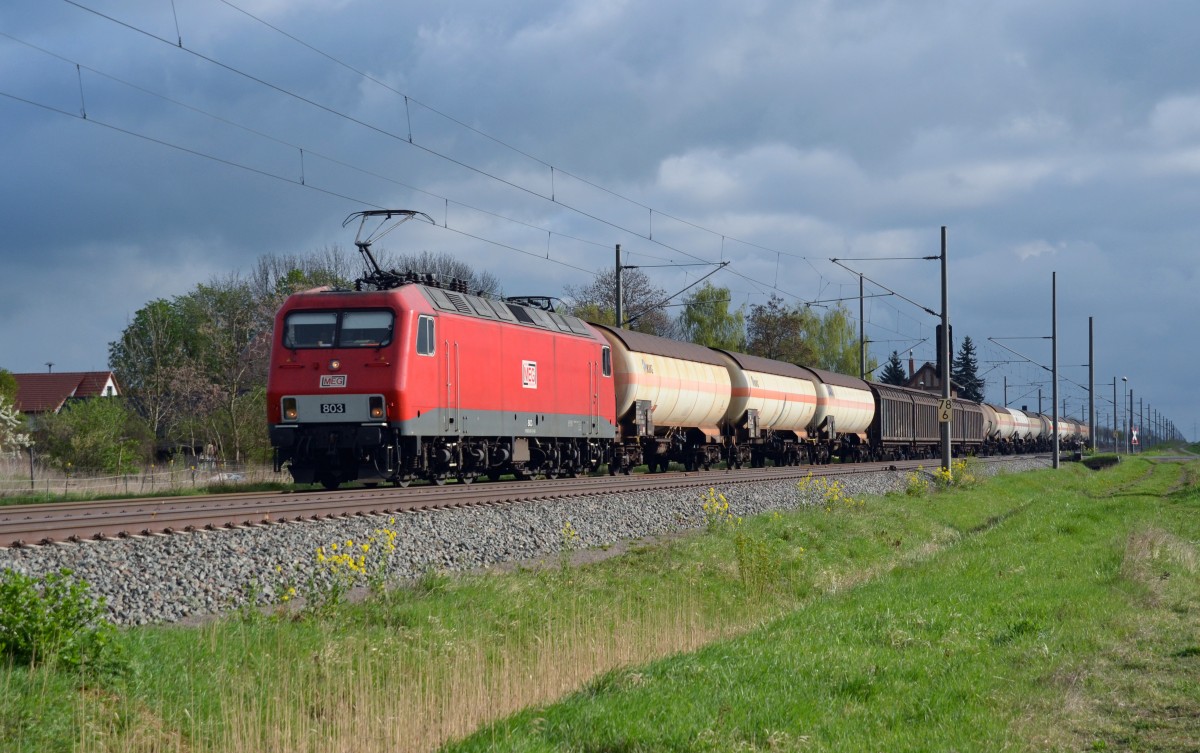 Die beiden RBH-Loks 143 638 und 143 273 führten am 10.04.14 einen Kesselwagenzug durch Braschwitz Richtung Halle(S).