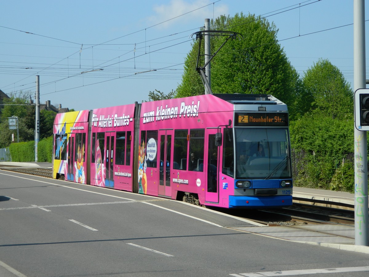 NGT8 der LVB - "Leoliner 1" Betriebsnummer 1125 "Thomas Müntzer" Baujahr 1995, auf Linie 2 in Richtung Naunhofer Straße (L-Stötteritz) mit Spee-Werbung am 25.04.2014