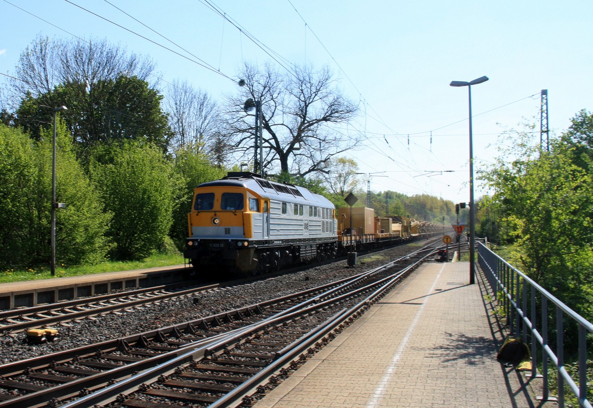 SGL V300.18 kommt aus Richtung Aachen-West mit einem langen Bauzug und am Zugende sind zwei 225er BBL Logistik GmbH und fährt durch Kohlscheid in Richtung Herzogenrath,Neuss bei schönem Frühlingswetter am 19.4.2014.