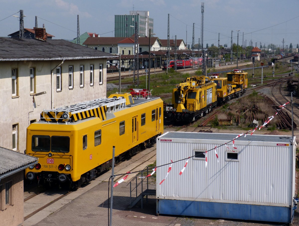Wegen umfangreichen Arbeiten an Gleisen und Oberleitung im Güterbahnhof Nordhausen standen am 25.04.2014 708 327-2 von DB Netz und zwei weitere Fahrzeuge der DB Bahnbaugruppe abgestellt im Bahnhof Nordhausen