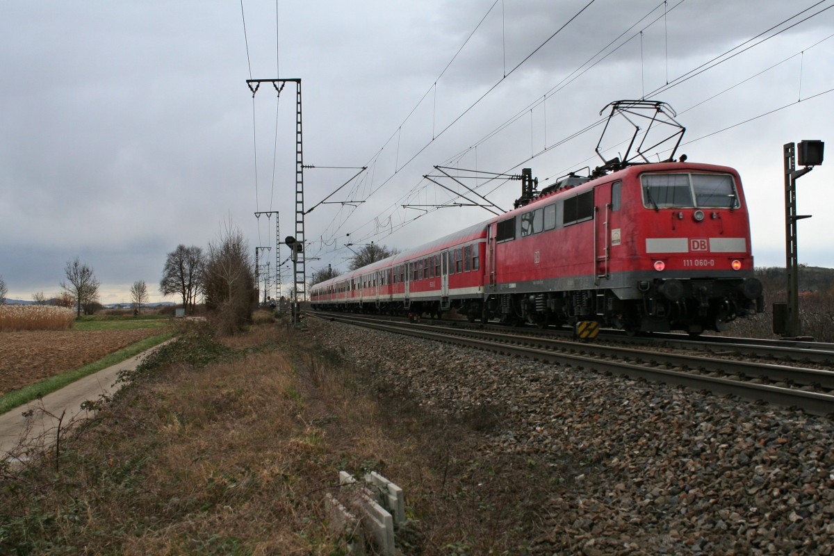 111 060-0 mit der RB 26566 von Neuenburg (Baden) nach Offenburg am Nachmittag des 28.02.14 beim Verlassen des Bahnhofbereichs von Müllheim (Baden).