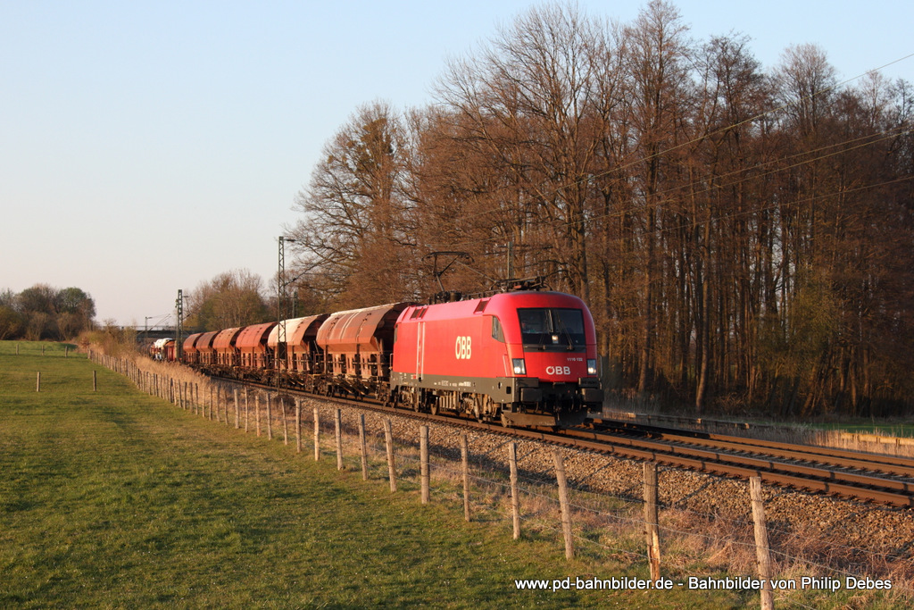 Die 1116 148 mit einer U-Bahn am 04.04.2014 unterwegs bei Teisendorf.