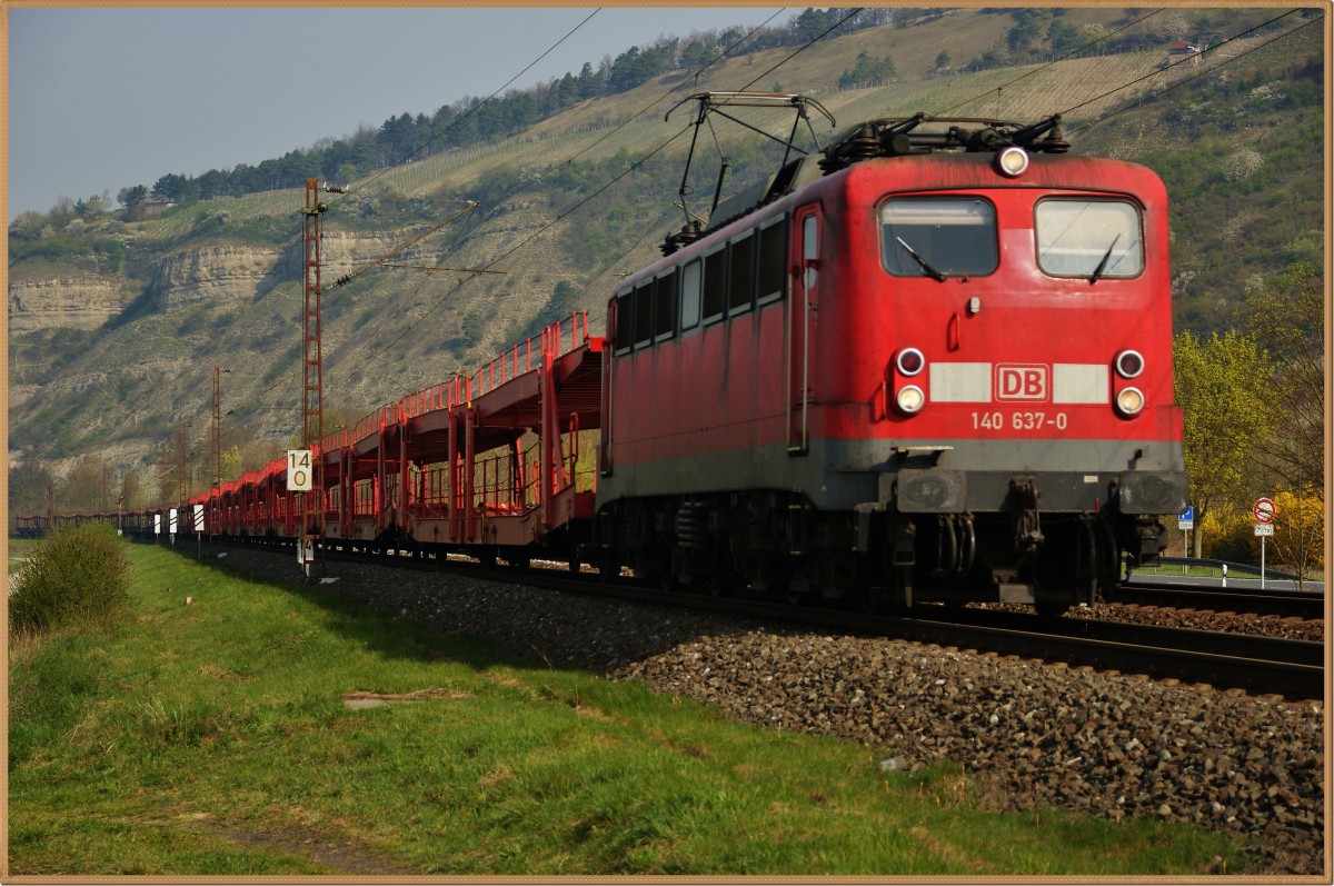 140 637-0 mit einen leeren Autozug Richtung Würzburg am 01.04.14 bei Thüngersheim.