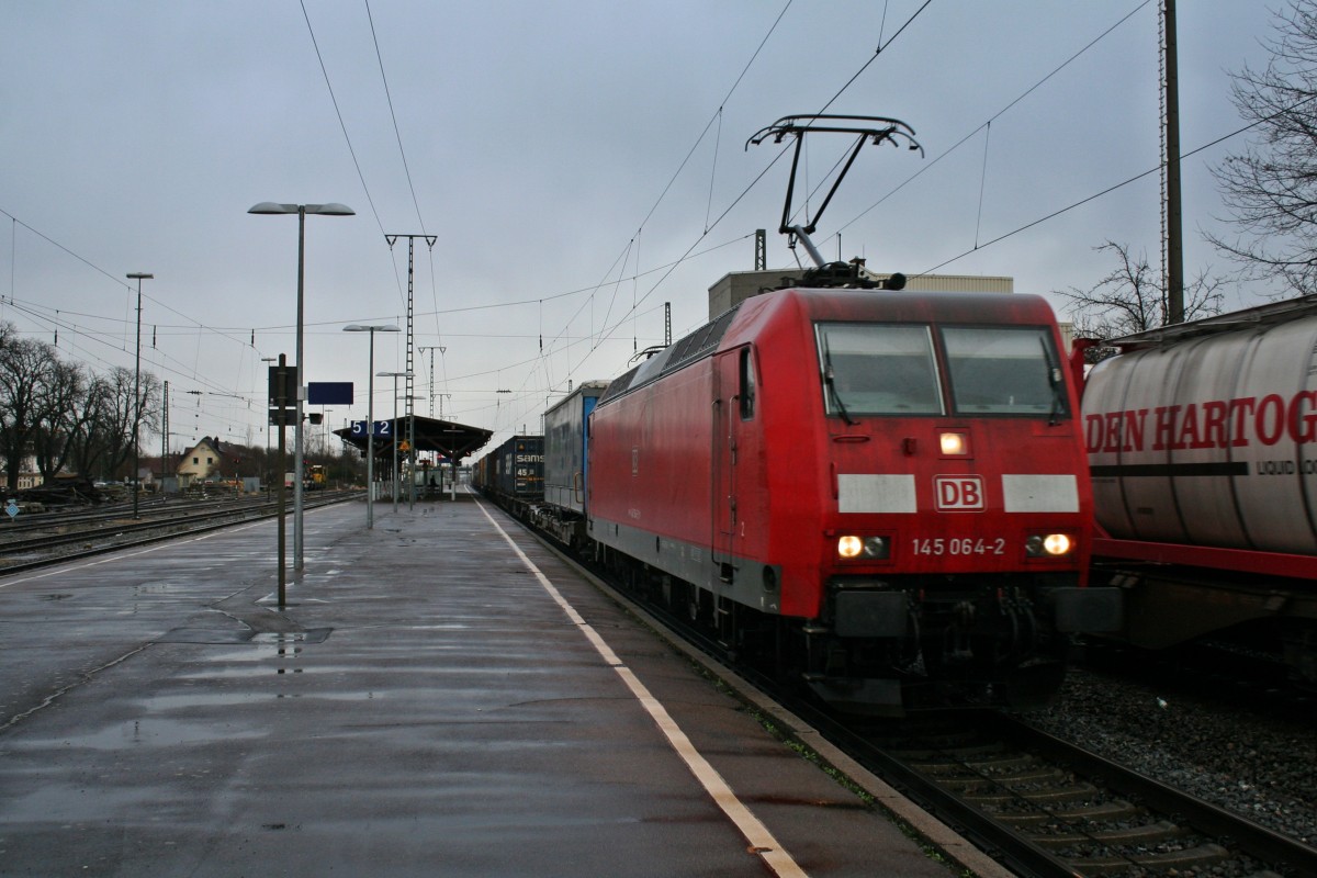 145 064-2 mit einem KLV-Zug gen Süden am Nachmittag des 28.02.14 in Müllheim (Baden).