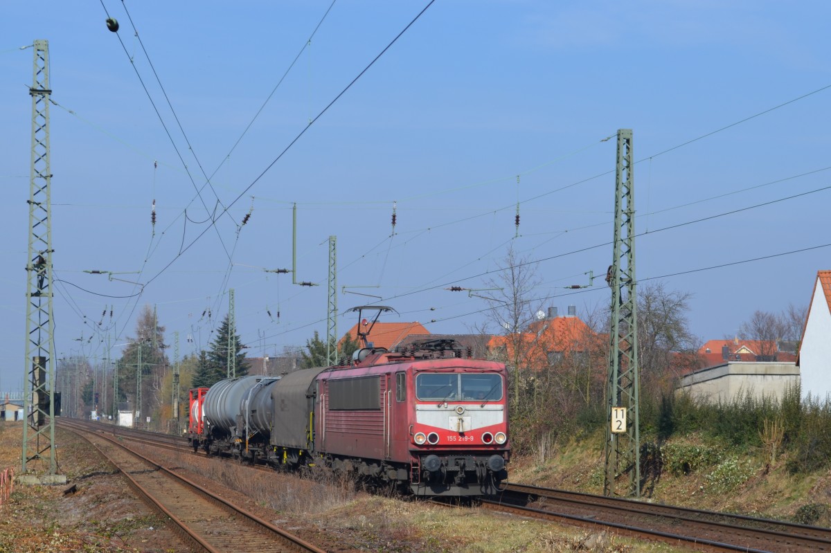 Hier E37 042-5 und E37 030-0 (kalt) mit einem Kesselwagenzug, bei der Durchfahrt am 29.3.2014 durch Berlin Schönefeld Flughafen, in Richtung Berlin Grünauer Kreuz.