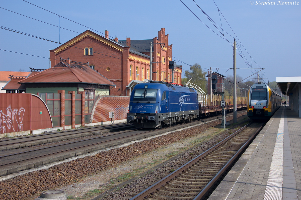 183 500-8 mgw Service GmbH & Co. KG für SETG - Salzburger Eisenbahn TransportLogistik GmbH hing am Zugende eines leeren Holzzug, der von der PRESS 145 023-6 gezogen wurde. Der Zug musste in Rathenow die Abfahrt des RE4 abwarten. 06.04.2014