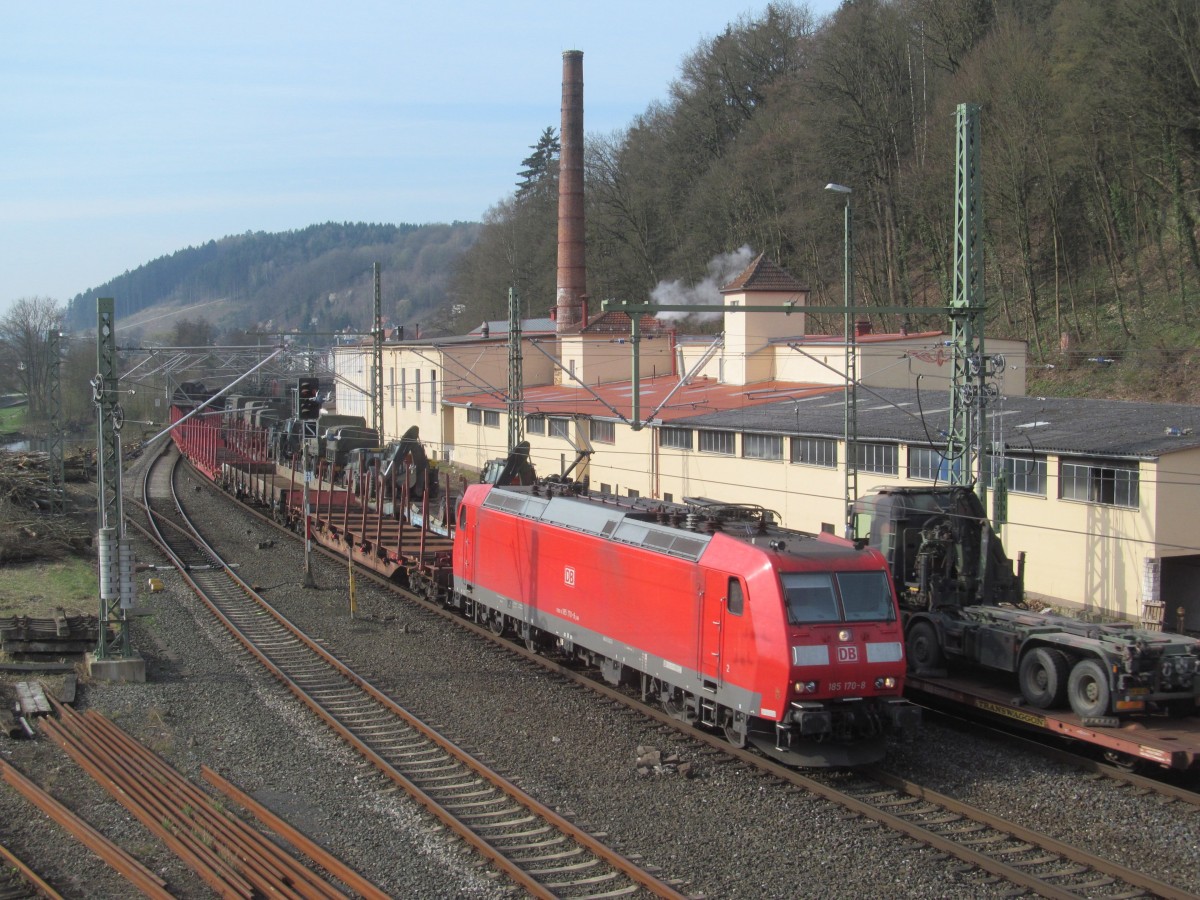 185 373-8 zieht am 26. März 2014 einen Militärzug durch Kronach in Richtung Saalfeld.