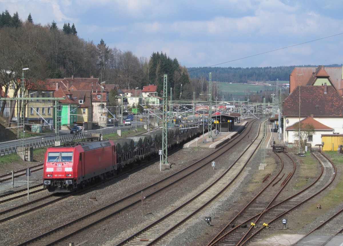 185 308-4 zieht am 26. März 2014 einen Militärzug durch Kronach in Richtung Lichtenfels.