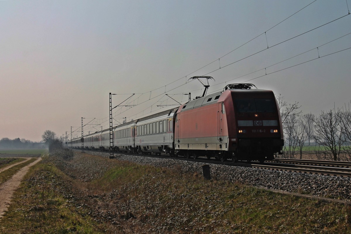 Am 08.03.2014 bespannte die 101 116-2 den EC 8 (Zürich HB - Hamburg-Altona), als sie auf der KBS 703 nördlich von Müllheim (Baden) aus dem Gegenlicht in Richtung Freiburg fuhr. Gruß auch an den netten Tf!