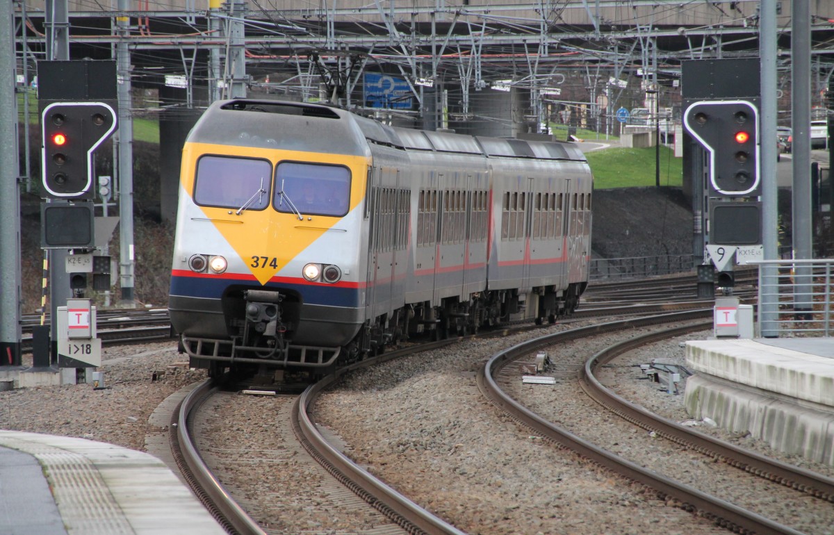 AM 80 Triebzug 374 in alter Lackierung, die noch sehr sauber ist, fährt am 13.1.14 in Liège Guillemins ein.