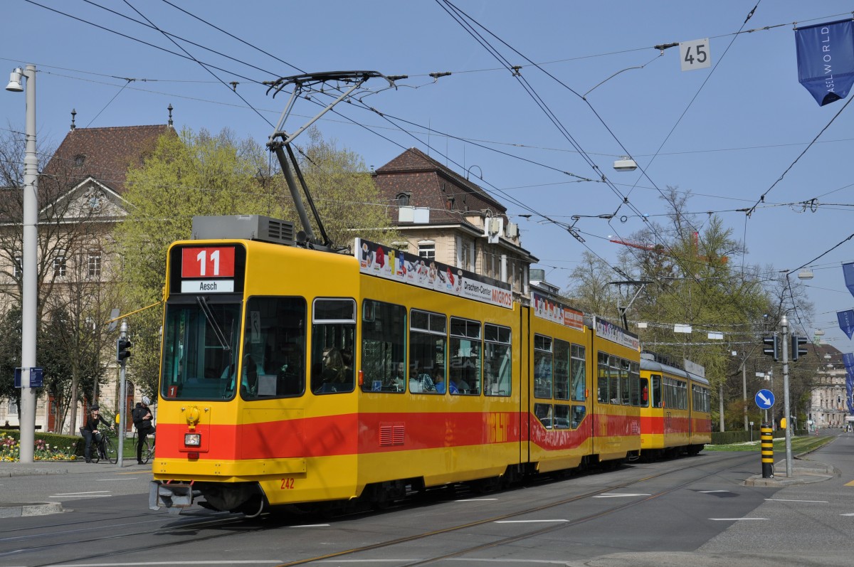 Be 4/8 242 zusammen mit dem Be 4/6 103 auf der Linie 11 am Bahnhof SBB. Die Aufnahme stammt vom 30.03.2014.