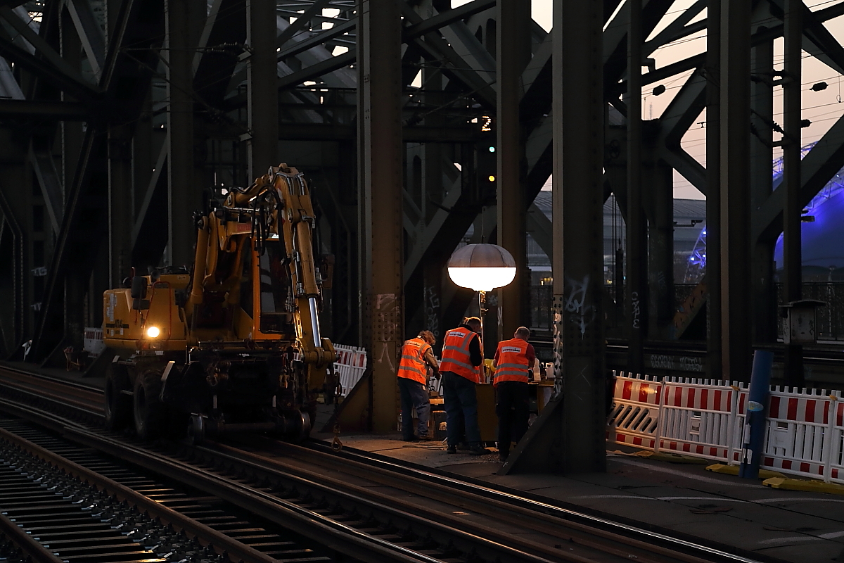 Während ein Zweiwegebagger am Abend des 13.03.2014 auf seinen nächsten Einsatz im Rahmen der zurzeit stattfindenden Sanierung der beiden südlichen Gleise auf der Kölner Hohenzollernbrücke, wartet, überquert ein ICE gemächlich das Bauwerk. Ein Mitarbeiter des Bauteams versucht indessen am Handy, trotz des gerade herrschenden Lärms, seinen Telefonpartner zu verstehen. Ob er gerade Anweisungen von seinem Chef erhält, oder sich mit seiner Freundin zum Abendessen verabredet, konnte ich leider nicht ergründen! ;-)