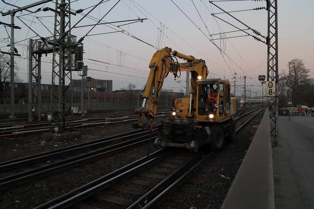 Diese Aufnahme entstand am Abend des 13.03.2014 in Köln-Deutz. Ein Zweiwegebagger ist gerade mit dem Aufgleisen beschäftigt, um danach wieder seine Aufgaben, im Rahmen der Sanierung der zwei südlichen Gleise auf der Hohenzollernbrücke, übernehmen zu können.