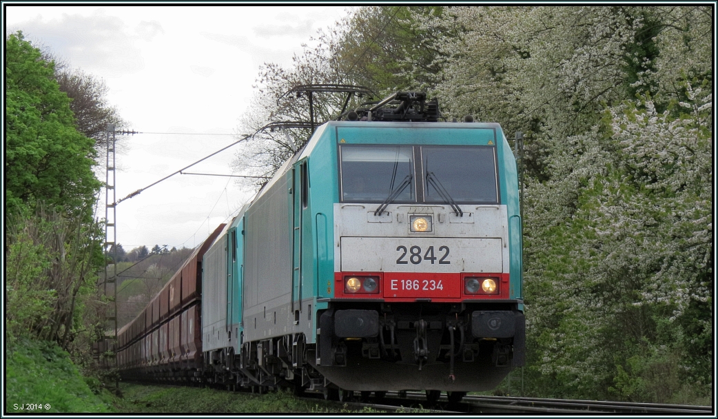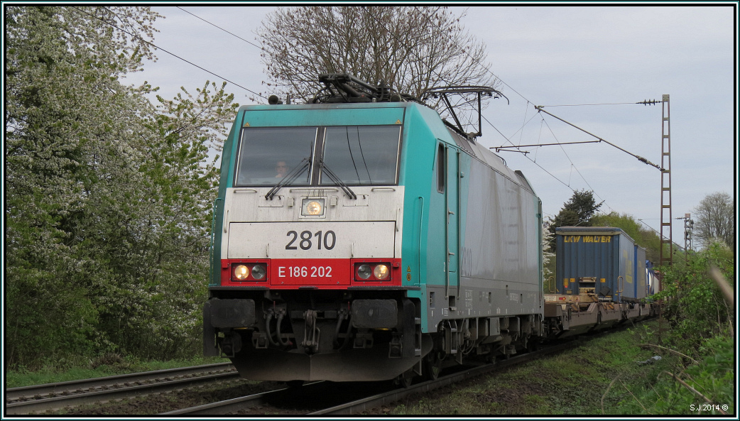 Hinauf nach Belgien,die 2810 (E-186) mit einen Aufliegerzug am Haken.Bildlich festgehalten am Gemmenicher Weg unweit von Aachen am 06.April 2014.