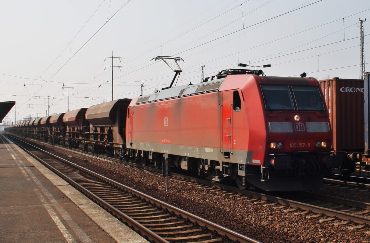 Hier 185 157-5 mit einem Schüttgutwagenzug, bei der Durchfahrt am 29.3.2014 durch Berlin Schönefeld Flughafen, in Richtung Berlin Grünauer Kreuz.