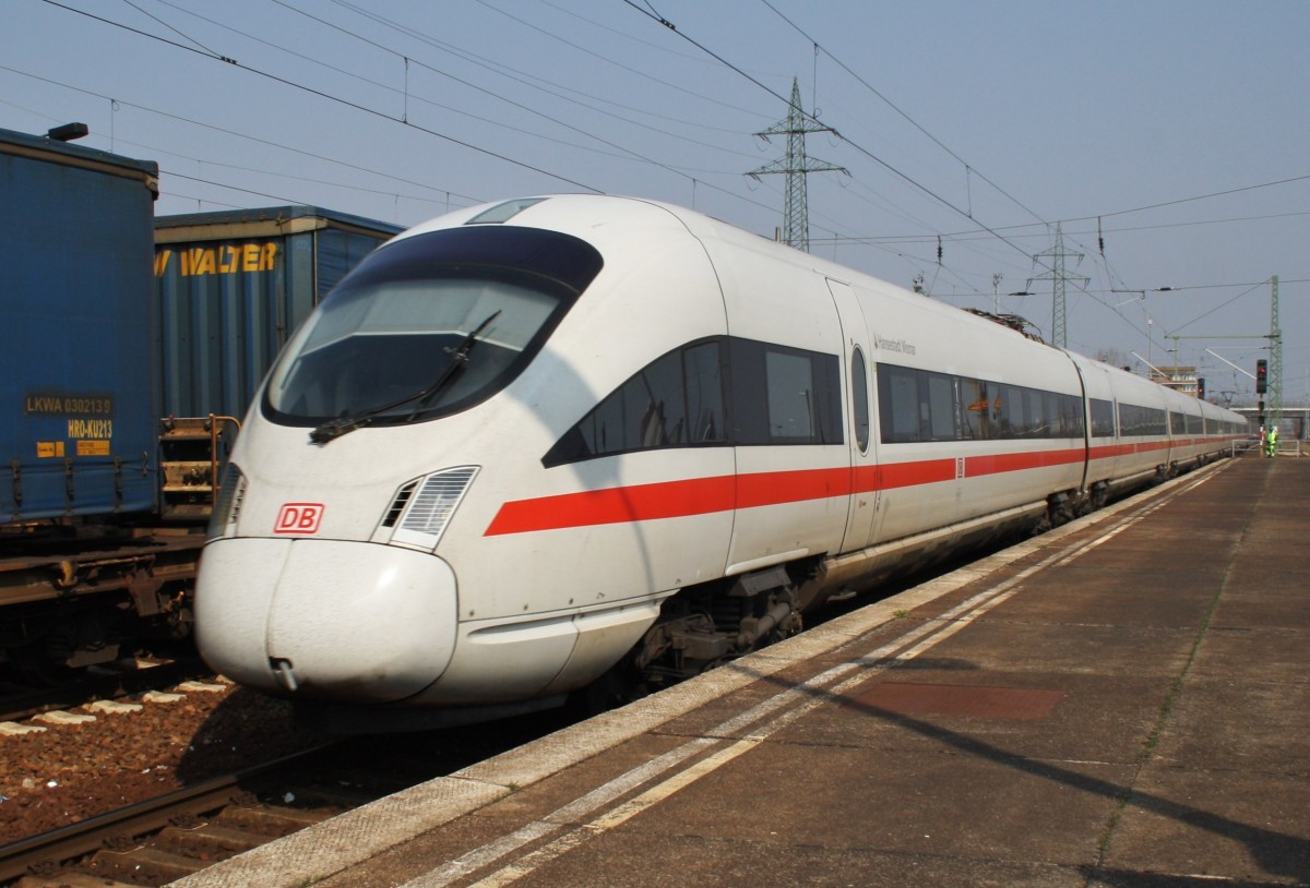 Hier 411 008-6  Hansestadt Wismar  als Leerzug von Berlin Rummelsburg nach Berlin Südkreuz, bei der Durchfahrt am 29.3.2014 durch Berlin Schönefeld Flughafen, in Richtung Gensahgener Heide.