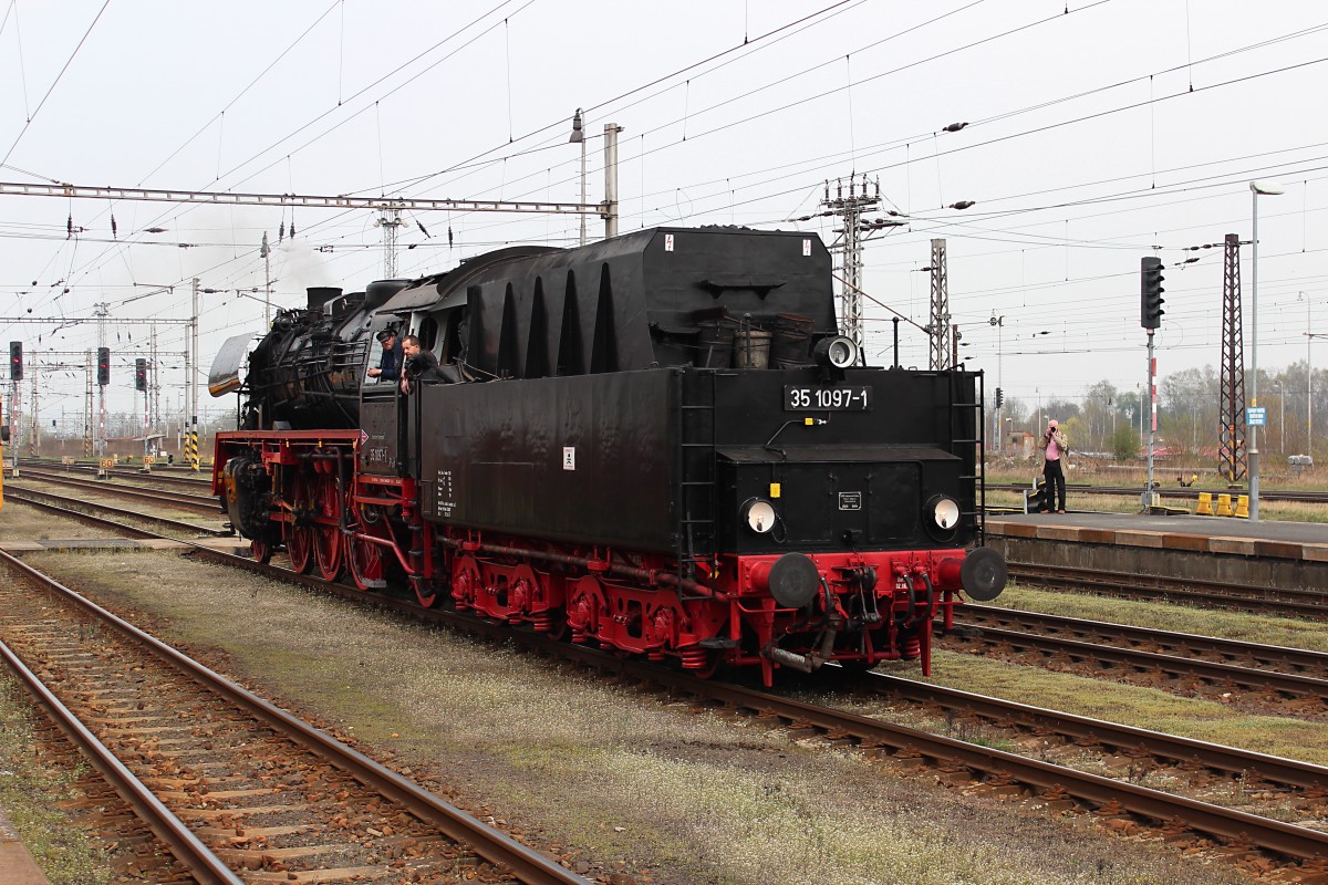 05.04.2014, Bf Meuselwitz; die 52 8154-8 vom Bw Leipzig-Plagwitz bespannt den Sonderzug der Berliner Dampflokfreunde zur Kohlebahn Meuselwitz auf der Strecke Altenburg - Meuselwitz - Altenburg