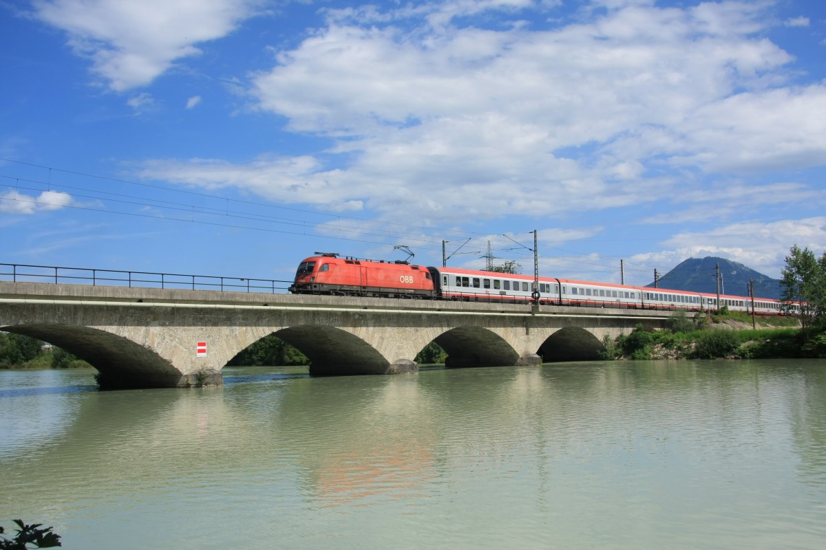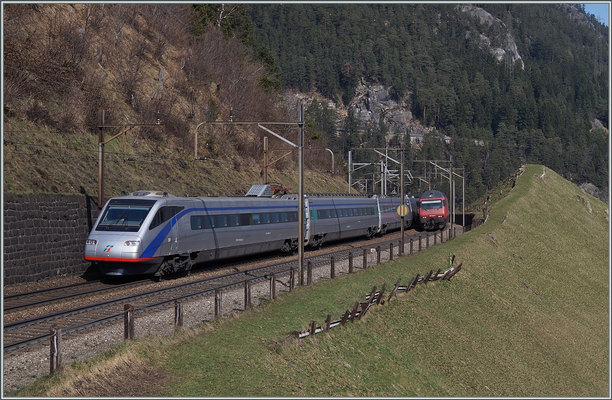 Während der FS ETR 470 als EC 14 von Milano nach Zürich die Obere Entschigtal Gallerie verlassen hat, kommt aus der Gegenrichtung bereits der IR nach Locarno ins Bild.