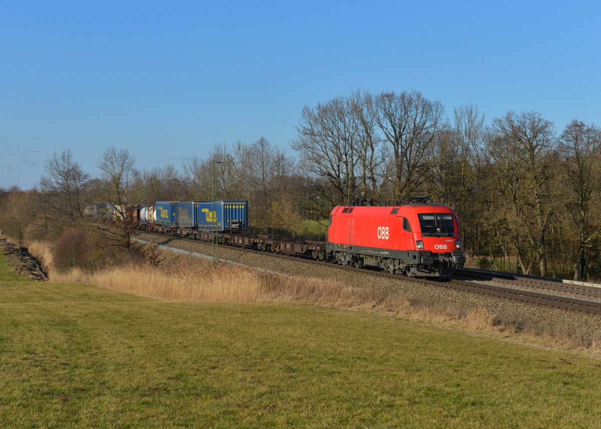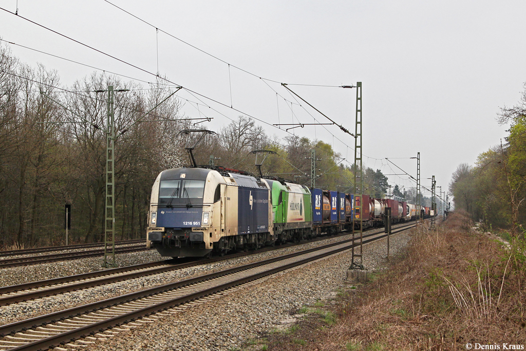 1216 951 und 1216 954 mit einem Containerzug am 05.04.2014 bei Haar.