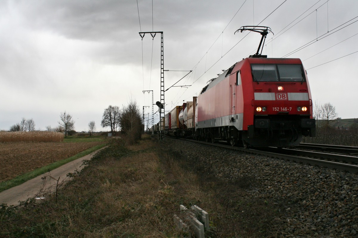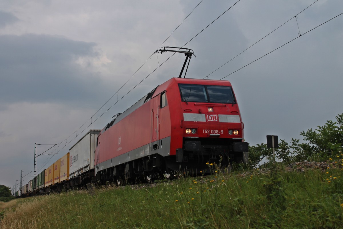 Am bewölkten 28.08.2013 fuhr die 152 008-9 mit einem gemischten DB Schenker Containerzug bei Hügelheim, auf der KBS 703 gen Norden.