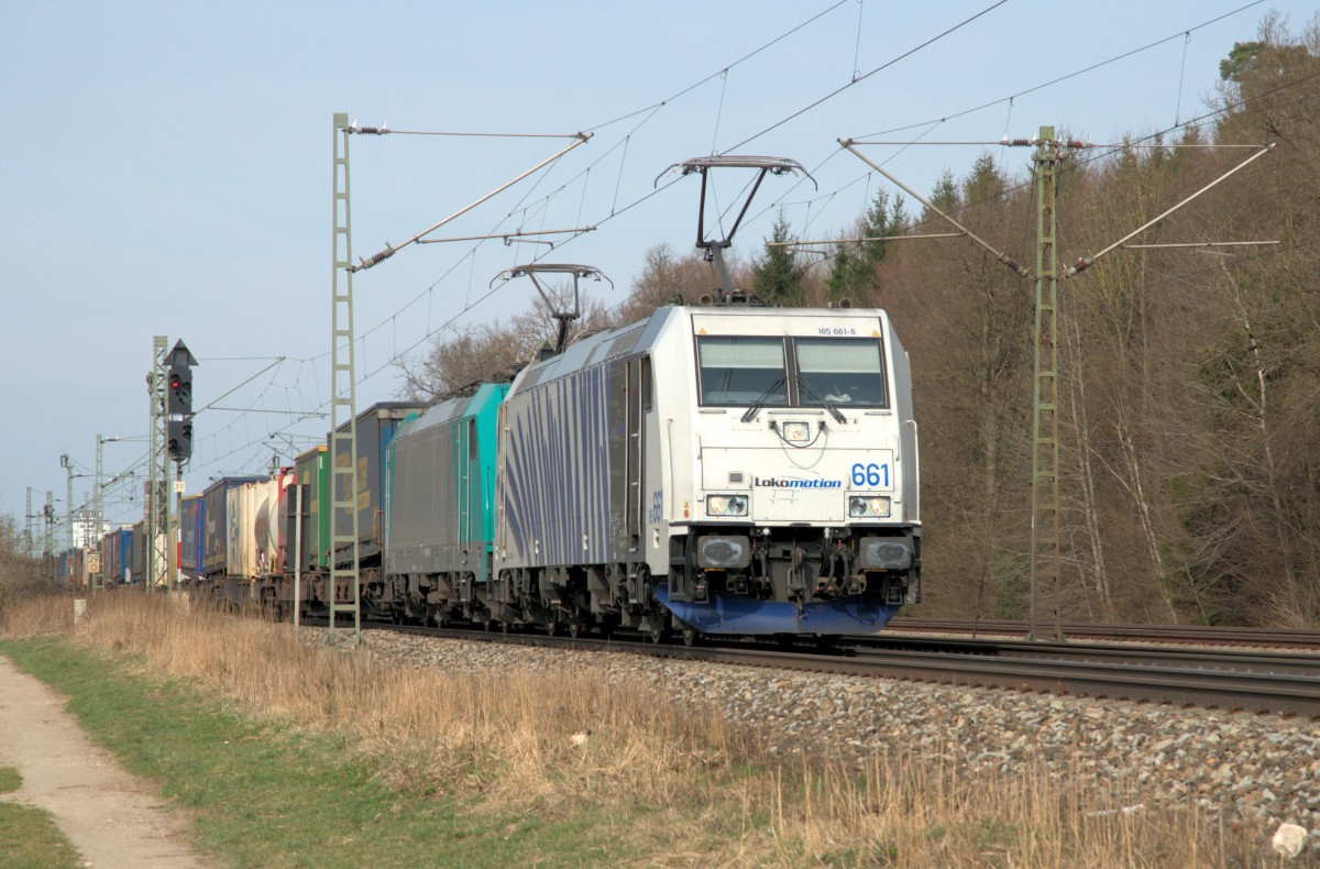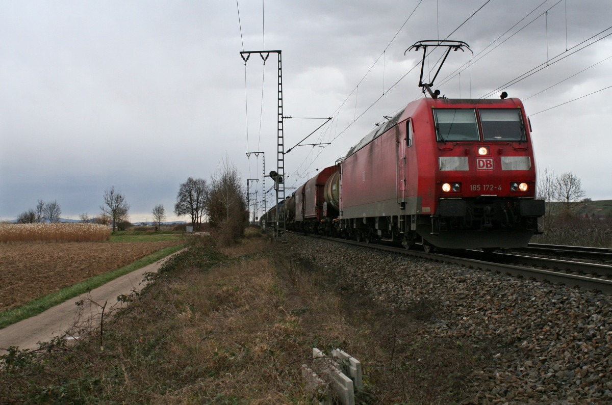 185 172-4 mit einem gemischten Güterzug gen Süden am Nachmittag des 28.02.14 in der nördlichen Einfahrt von Müllheim (Baden).