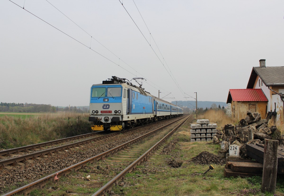 242 219-4 ČD bei Ankuft mit Fernzug R 811 "Gemeran" ("Der Gemerer") Bratislava hl. st. (08:01) – Zvolen os. st. (10:58/11:13) – Košice (14:37) nach Altsohler Personenbahnhof (Zvolen os. st.); 06.04.2014