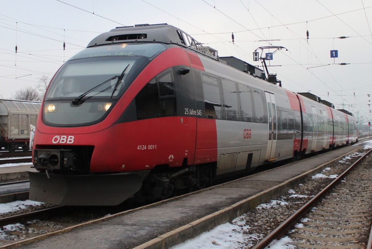 4124 001 "25 Jahre S45" nach der Ankunft mit dem R 7841 von Bruck an der Leitha (Bl) in Wulkaprodersdorf (Wul); am 04.02.2014