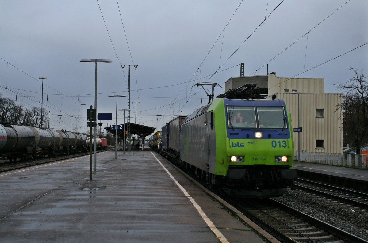 485 013-7 mit der stark verspäteten RoLa (DGS) 43627 von Freiburg (Breisgau) Gbf nach Novara am Nachmittag des 28.02.14 im Bahnhof Müllheim (Baden).