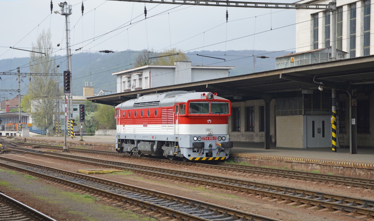 754 010-7 rangiert im Personenbahnhof von Zvolen/Altsohl (Mittelslowakei). 1978 gebaut für die ČSD als T478.4010; bis 1987 beheimatet in Depot Plzeň/Pilsen (CZ), danach in Zvolen; 06.04.2014