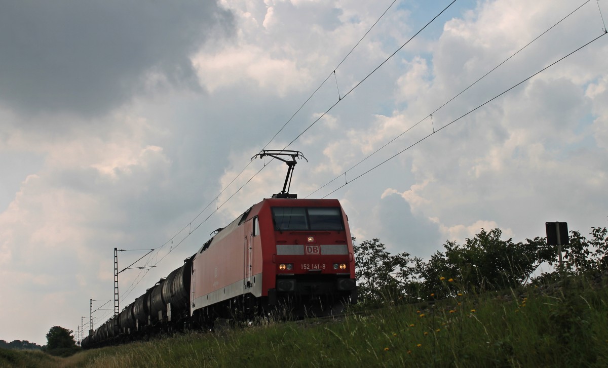 Auch am 28.08.2013, die Nürnberger 152 141-8 mit einem langen Kesselwagenzug bei Hügelheim gen Norden.